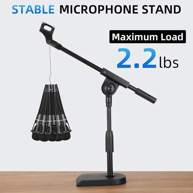 Sturdy Weighted Base for Stability: this desktop mic stand features a solid 4.85 lbs (2.2 kg) metal base for reliable support and anti-tip performance; It can hold microphones weighing up to approximately 2.2 lbs (about 1 kg), making it suitable for most condenser and dynamic mics; The anti-slip rubber pad underneath absorbs shock and protects your tabletop, ideal for podcasting, home studio, or amp setups