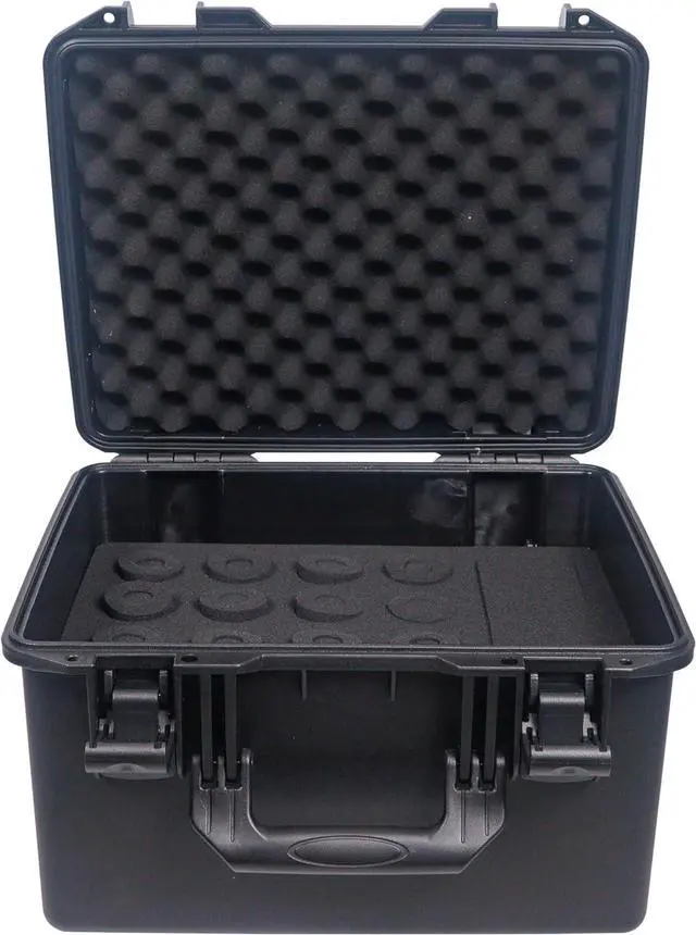 Customized Protection: Custom-cut foam drops securely hold up to 16 handheld microphones, while the convoluted foam lining on the lid adds extra cushioning.