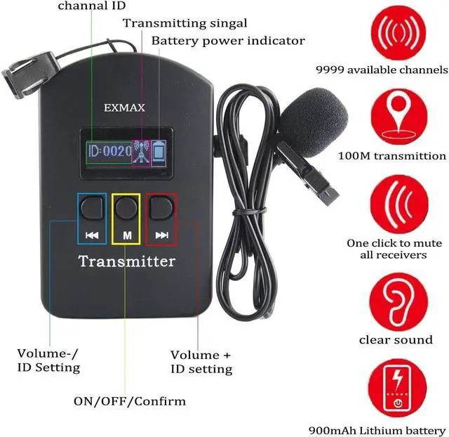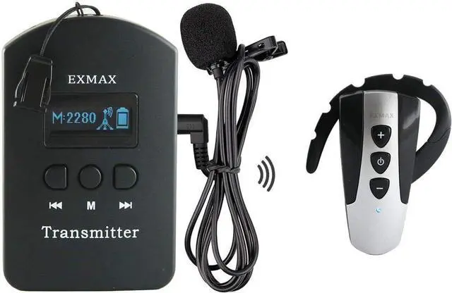 Dual Presenters ModeEXMAX EXD-6824 Wireless tour guide system enables TWO transmitters speaking on the same channel in each group. Transmitter has an AUX input for connecting MP3, Smartphone,MP4, playing background music or pre-recorded voice files.9999 Selectable 2.4GHz licence-free world-wide channels accommodating hundreds of groups working on the same place as long as they are on different channels. Speaking at a comfortable level to the group whilst ensuring they are clearly heard.