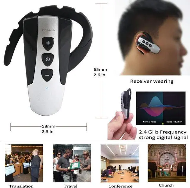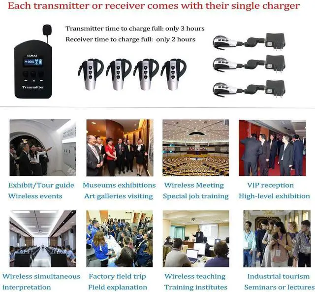 Small and light to carry,each little device comes with its own charger;Small size;0.15lb weight for the transmitter with 0.04lb for each receiver;convenience for a listener to hang on the ear.The channel of all the receivers can be adjusted together by transmitter.The transmitter has mute function.If the interpreter sometimes does not want the audience to hear his speech, he can press the mute button and the audience will not hear his speech.