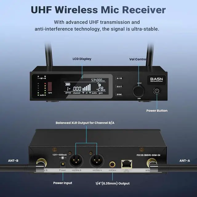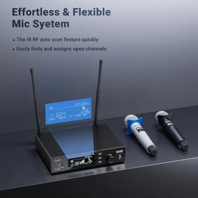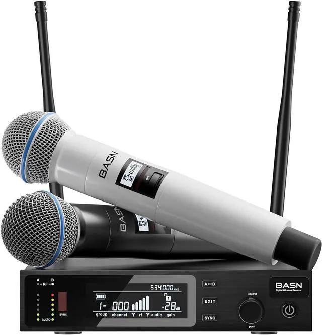 : BASN handheld wireless mic set built with aluminum alloy body withstands drops, scratches, and rough handling on stage or at outdoor events. Reinforced coating resists sweat, humidity, while the weighted grip ensures stable, fatigue-free use