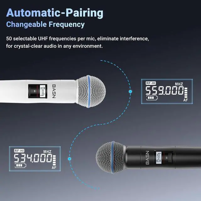 : The basn metal handheld microphone set is with advanced UHF transmission and anti-interference technology, the signal is ultra-stable. It has 50 selectable frequencies per UHF mic and operating distance is up to 328 ft(100 m) in open areas