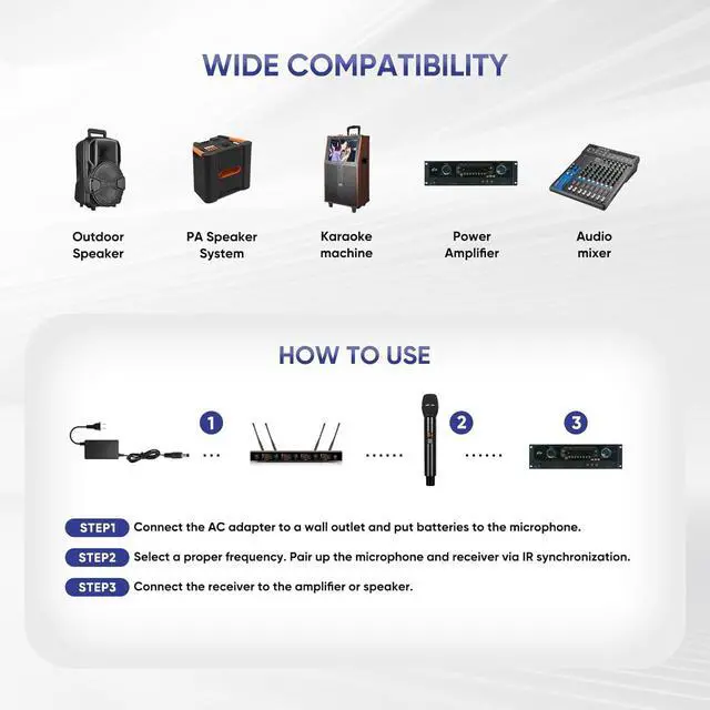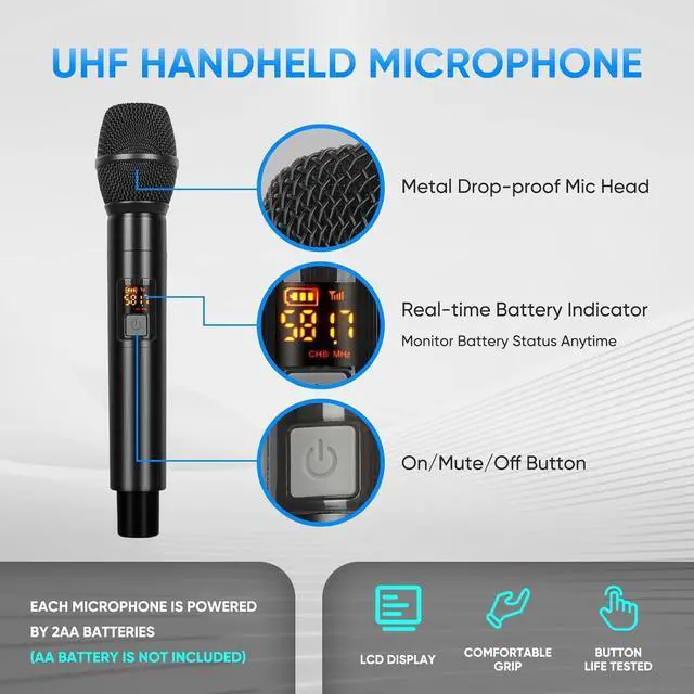 Simple Operation & Wide Compatibility - Turn on the receiver and wireless microphone and they will automatically pair without additional setup. The wireless microphone system is compatible with audio amplifiers, TVs, home theater systems, and stage speakers. Note: Not compatible with laptops, iPads, cellphones, or AV receivers. Each microphone requires 2 AA batteries (not included).