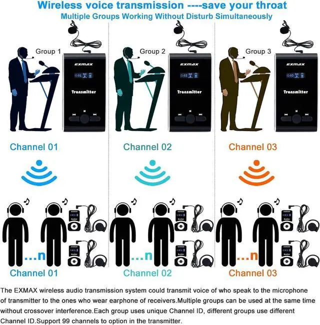 The EXMAX wireless audio transmission system could transmit voice of who speak to the microphone of transmitter to the ones who wear earphone of receivers,transmission distance is about 20-30 meters (65-100ft).40 frequency channels mean it has 40 select IDs allow at least 10 groups to work simultaneously.Widely used for field trip,tour exhibit guides,sermon interpretation,work-study,conferences,translation,audio visual laboratory,events for church,family,restaurants,hajj...