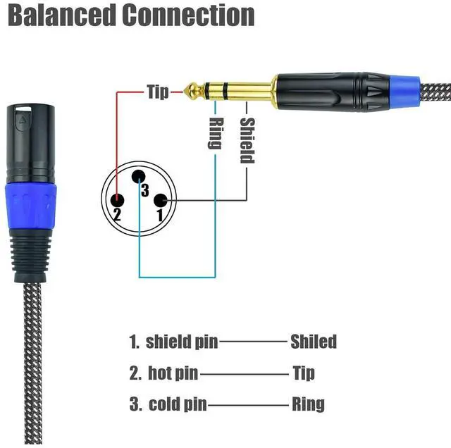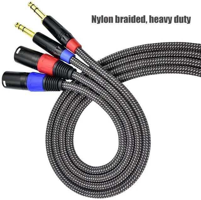 Specification This balanced 1/4inch to 3pin XLR Male cable is 50FT long. The wire is nylon braided, it's strong and heavy duty. 1/4inch plug is gold plated, signal can go through gold plated plug with less lose. This TRS plug is also drag-proof design, the plug tail will hold the wire tightly, so the wire won't be pulled out easily. With drag-proof design, the cable can last much longer. It's also strong enough for long distance transmission.