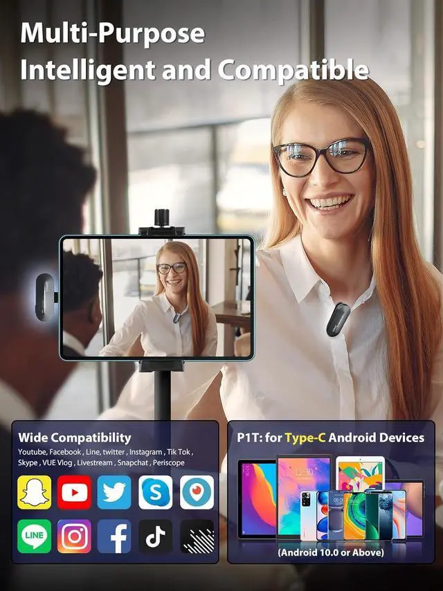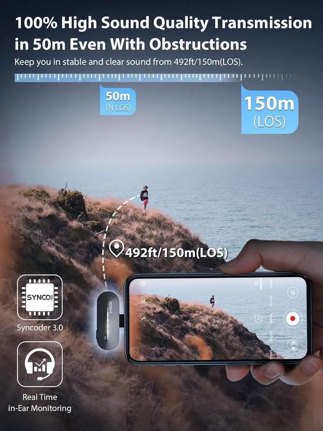 Obstacle-Free and High-Fidelity TransmissionFollowing Syncoder 3.0 and intelligent DSP chip, SYNCO P1 P1T 2.4Ghz wireless lavalier smartphone microphone for Android Type-C devices keeps you in stable and clear sound from 492ft/150m(LOS area), filters out low-frequency noise and reproduces faithful and clean voices