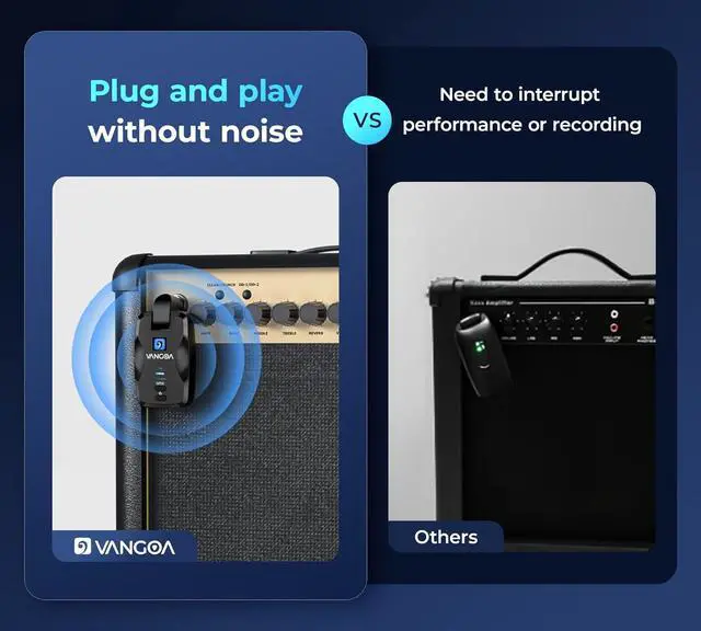 [Plug and Play] Guitar wireless system with mute plug, so easy to use and get rid of the wire tangled. Turn on the transmitter and the receiver, long press the signal key to match transmitter and receiver at the same time.