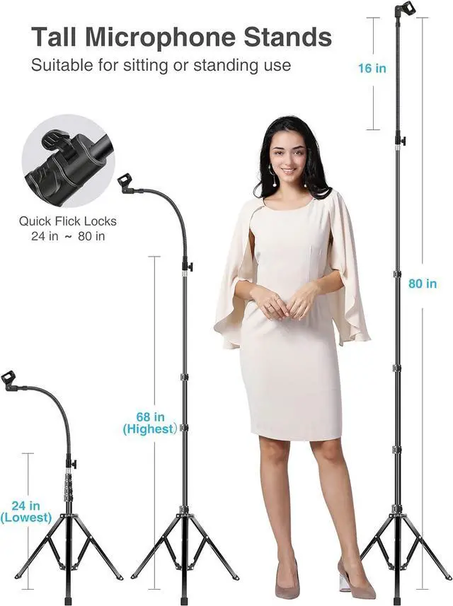 Mic StandThe maximum height of microphone stand is about 82 inches (6.7 feet), when you bend the flexible 16 inch gooseneck, it is still as height as 70 inch. And thanks to its telescopic and quick-flip design, you can quickly shift this boom microphone stands height from 16 inches to 82 inches at will; while others only have limited height adjustment.