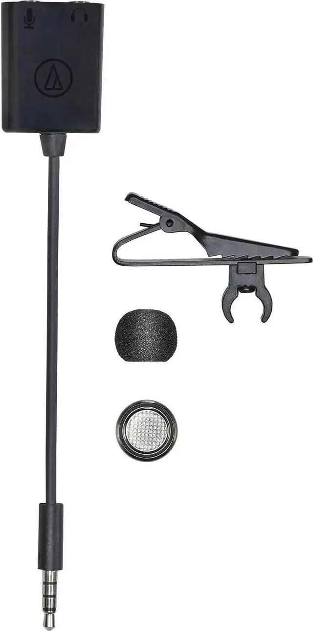 Includes lavalier clips, windscreens, LR44 batteries, and adapters