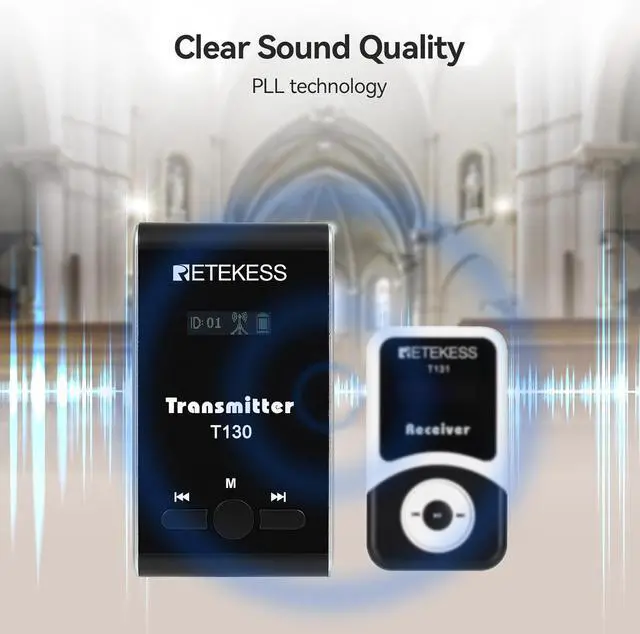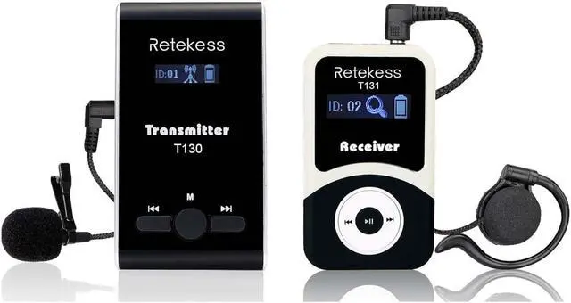 Retekess T130 tour guide system is used for distance voice transmission; it transmits the voice of the speaker holding the transmitter to the listeners with the receiver; wireless distance is about 60m; widely used for factory tour, school activities