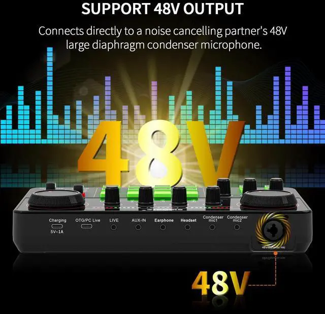 [Multi-Function Podcast Audio Mixer]9 Independent volume knob adjustments and 2 fader button adjustments, covering bass, alto, treble, backing track and monitoring, etc, the breathing light can follow the volume to change synchronously. The digital sound mixer supports 8 kinds of personalized sound effects and 4 Customize sound pads. These features make a live stream or a podcast more entertaining and meet more live recording needs, enough to meet the needs for podcasting beginner.