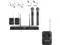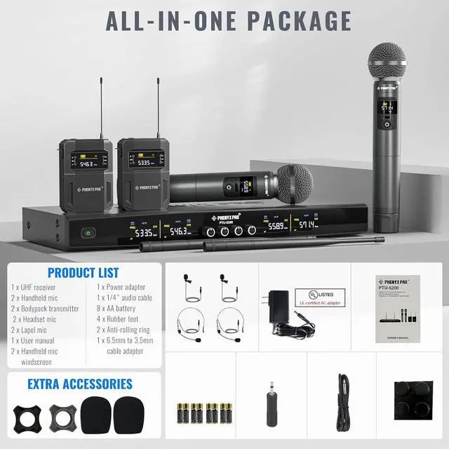 BOX CONTENT: 2 x handheld microphone wireless, 2 x bodypack wireless, 2 x headset microphone, 2 x lapel lavalier microphone, 1 x UHF wireless receiver, 1 x user manual, 1 x power adapter, 1 x 1/4 audio cable, 1 x 6.35mm to 3.5mm adapter, 8 x AA battery, 2 x anti-rolling ring, 2 x handheld mic windscreen, 4 x rubber foot