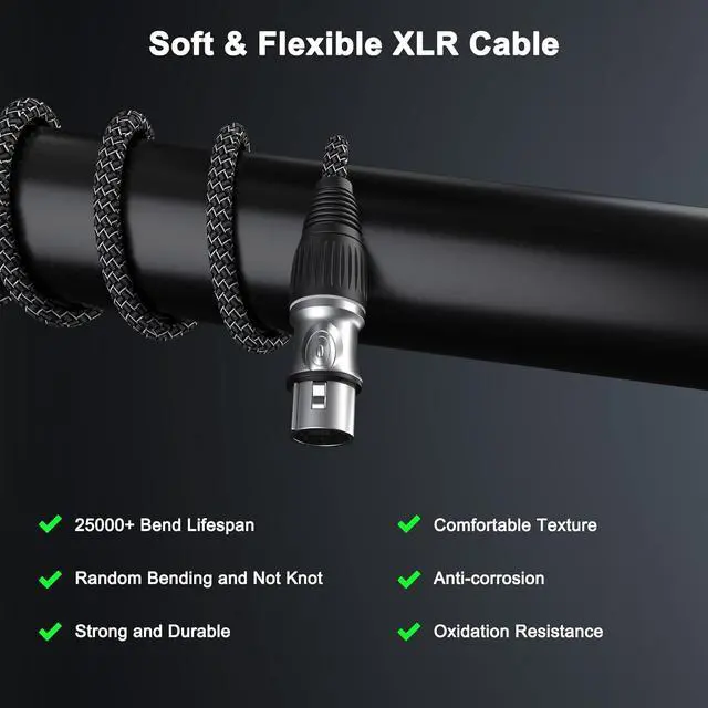 Durable XLR CableThe balanced XLR to XLR cable features multi-layer protection (imported high-elastic PVC and nylon braid). Compared with ordinary PVC without braid, our XLR cables are more durable, not easy to crack, not knotted, and wear-resistant. Bend test up to 25,000+ times without reducing microphone cord flexibility and ensure its optimal performance.