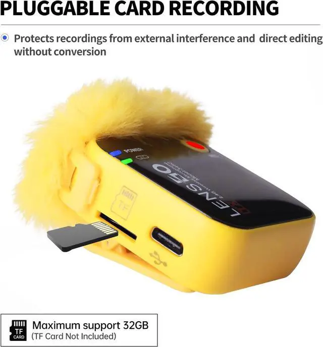 TF Card Record & One Click RecordingLENSGO LWM-348C lapel microphone with Built-in TF card slot, 32 GB Max Capacity. Record audio synchronously to prevent loss of recorded audio and save instantly. External REC recording button can realize one-key start/pause of the built-in card recording function.which can avoid some embarrassing situations effectively