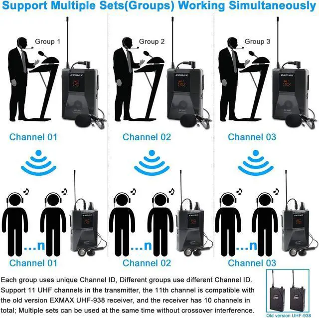 Long-distance range UHF wireless voice acoustic audio transmission systemEXMAX EX-938 wireless headset microphone tour guide simultaneous interpretation church translation system could transmit the voice of who speaks to the microphone of transmitter to the people who wear earphone of the receivers,transmission distance is about 150 meters/492ft.This EX-938 voice acoustic transmission equipment helps tour groups/speakers/lecturers/minister overcome background noise and keep social distancing.
