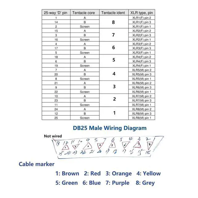 Please refer to the drawings for their wiring methods, as this will affect their functionality; DB25 to 8 Channel 3Pin XLR Snake Cable: This balanced snake cable is ideal for or interfacing a single cable to compatible equipment such as patch bays, multi-track recorders, and mixers to provide a clean and simple installation