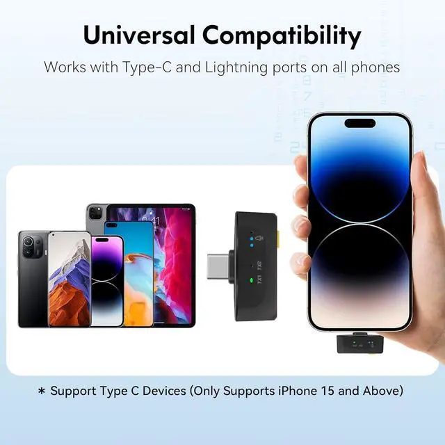 Type-C Wide CompatibilityThe upgraded wireless microphones are compatible for iPhone, iPad, Android phones, as well as Windows and Mac computers (includes adapters for iOS and TYPE-C ports). Suitable for video recording, podcasts, vlogs, TikTok, YouTube, Instagram, Facebook, and more.