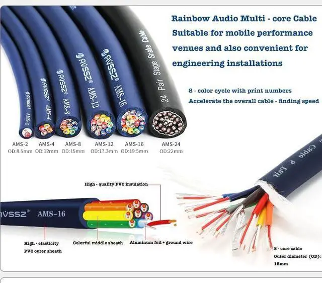 Rainbow Audio Multi core Cable, suitable for mobile performance venues and is also very convenient for engineering installations. You can quickly find the cable number by using the resistance color code, which significantly speeds up the on-site installation process