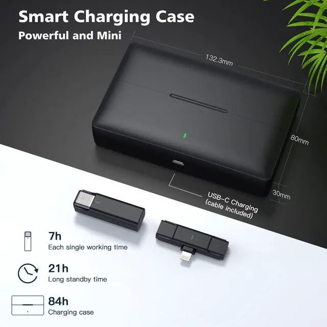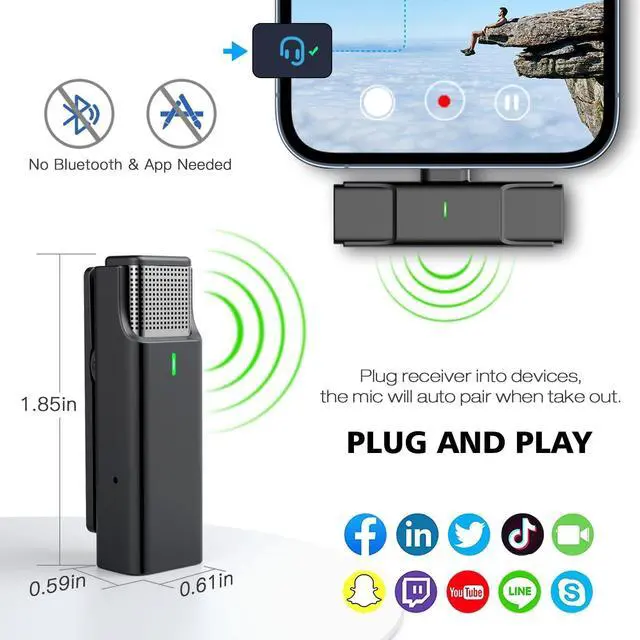 Plug-Play Mini MicsEnjoy a hassle-free setup with our plug and play wireless lavalier microphone. Remove the wireless lavalier microphone from the charging case without the need for adapters, Bluetooth or apps. Works with iPhone 14/13/12/11/X/XS/8 series and iPad.
