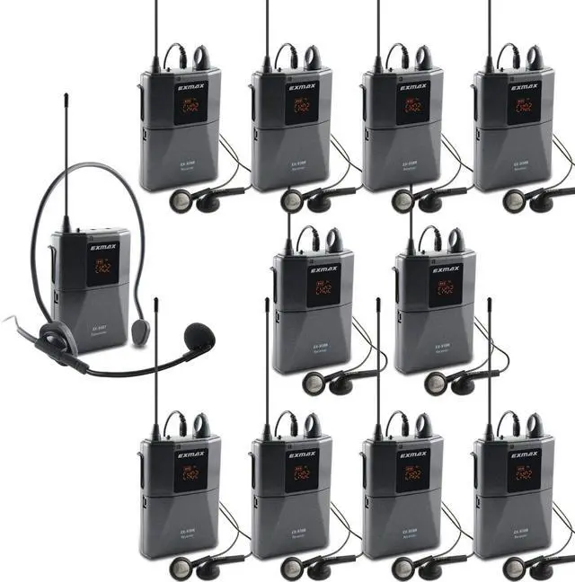 Long-distance range UHF wireless voice acoustic audio transmission systemEXMAX EX-938 wireless headset microphone tour guide simultaneous interpretation church translation system could transmit the voice of who speaks to the microphone of transmitter to the people who wear earphone of the receivers,transmission distance is about 150 meters/492ft.This EX-938 voice acoustic transmission equipment helps tour groups/speakers/lecturers/ministers overcome background noise and keep social distancing.