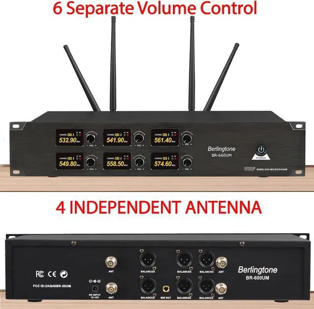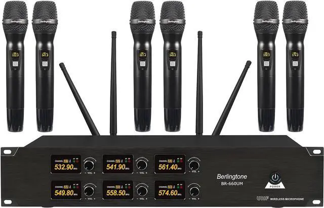PROFESSIONAL 6-CHANNEL UHF PERFORMANCE Features fixed frequencies (527.5MHz, 523.2MHz, 535.9MHz, 539.5MHz, 566.5MHz, 561.7MHz) for ultra-stable signals with no distortion. Delivers clear, true sound with individual volume control on each channel for precise vocal balancing.