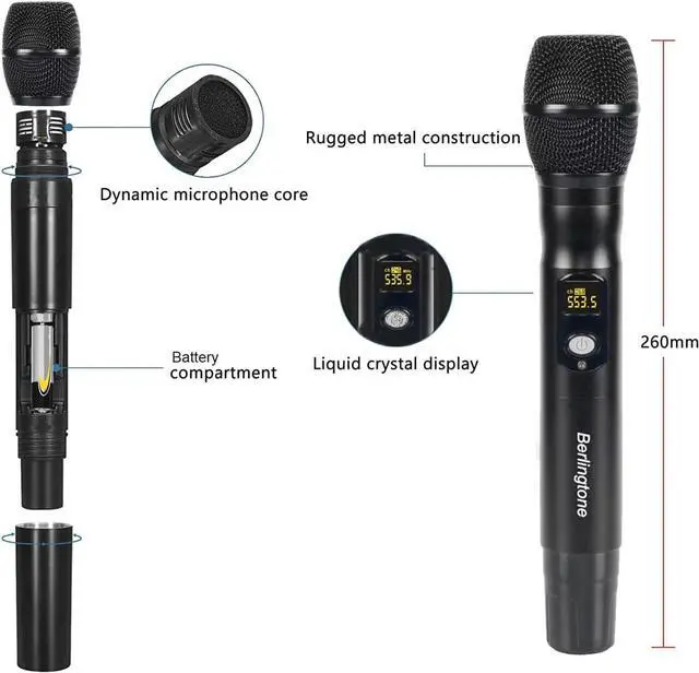 ALL-METAL CONSTRUCTION & FCC CERTIFIED Durable all-metal wireless microphones and receiver ensure long-lasting use. Fully FCC certified and compliant with new FCC rules for safe, reliable operation at parties, weddings, church services, and indoor-outdoor events.