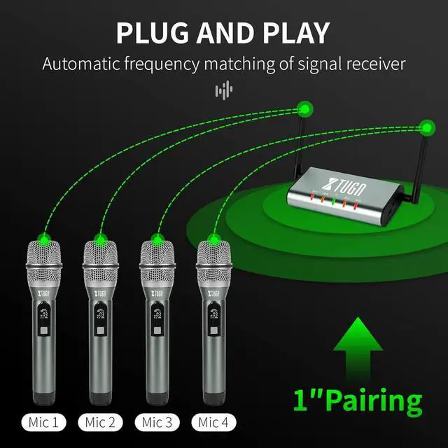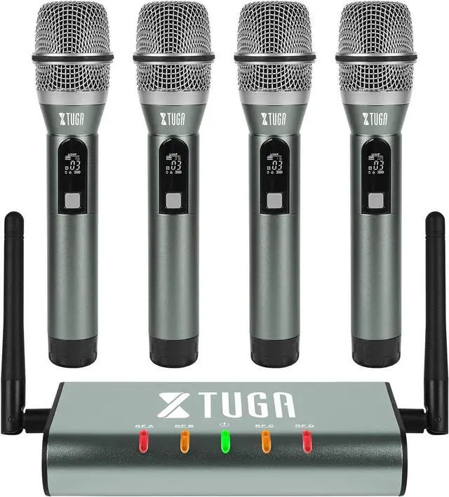 UHF MICROPHONE SYSTEM: XTUGA UF4600 4 Channel Wireless Microphone System Using UHF fixed high-frequency line design, avoid the frequency of interference easily. Deliver clear, robust, optimal true sound. Perfect used for karaoke, parties, church, DJ, weddings, outdoor or indoor stage performances etc.