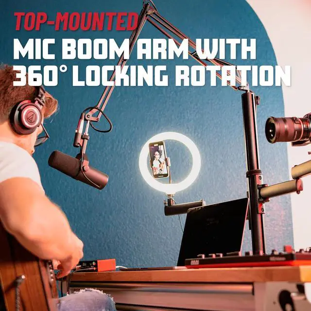 Standard Boom Arm for Microphones: Top-mounted mic boom arm with 360-degree locking rotation for precise positioning.