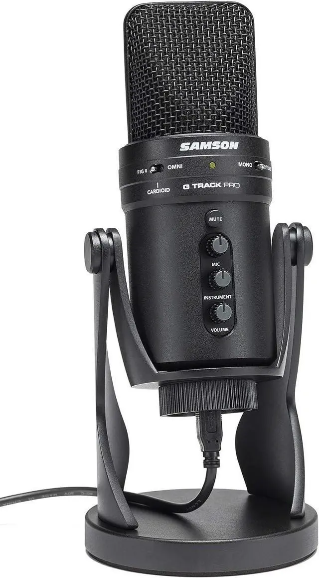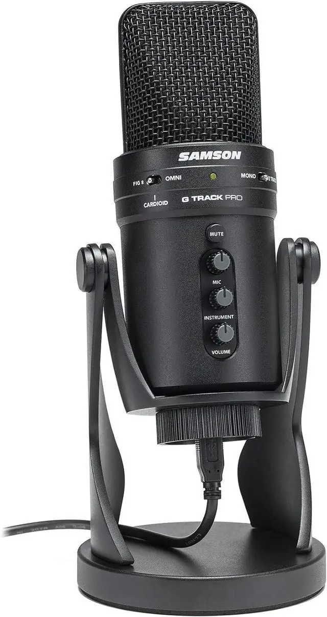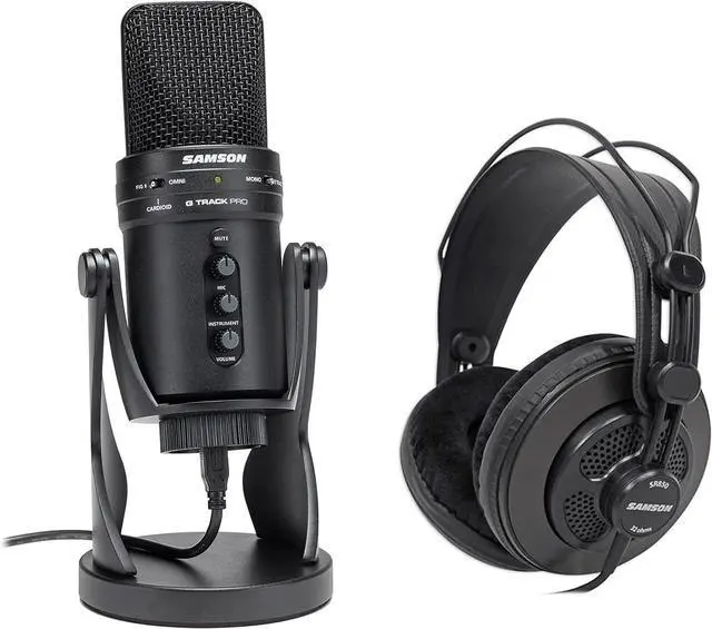 Package Includes: (1) Samson G-Track Pro Studio USB Condenser Microphone Mic+Built in Audio Interface. (1) Samson SR850 Professional Semi-open Studio Reference Monitoring Headphones. SAMSON G-Track Pro Studio USB Condenser Microphone w/ Built in Audio Interface. Element Type: Dual back electret condenser. Diaphragm Width/Thickness: 25mm/3 microns