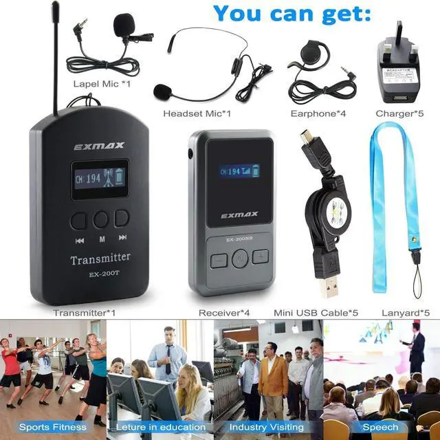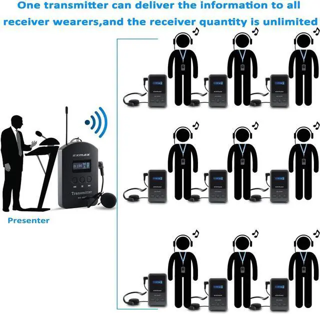 EXMAX EX-200N wireless tour guide system could transmit audio voice messages from a presenter to audience listeners. The presenter speaks into a microphone transmitter and the audience use lightweight earphone-receiver to hear the message.This is a completely wireless tour guide system with best-in-class sound combined with easy setup and operation.This is the leading solution for plant tour headsets with one-way communication,make sure everyone gets the message with crystal clear audio.