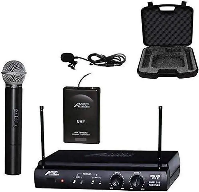 UHF dual-channel wireless system including one handheld wireless microphone, one body-pack wireless transmitter, one lavalier microphone, and one wireless receiver