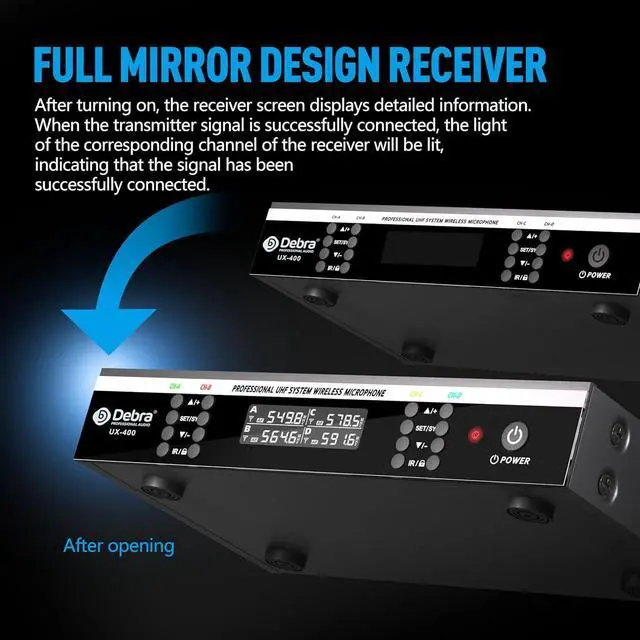 Full-Metal UHF Professional SystemThe Debra UX-400 features a full-metal construction with a mirror finish, paired with UHF band wireless transmission. It effectively resists interference, delivering stable and clear signals. Despite its sturdy structure, the system is lightweight, making it easy to carry and set upan ideal choice for professional scenarios such as performances, meetings, and teaching.