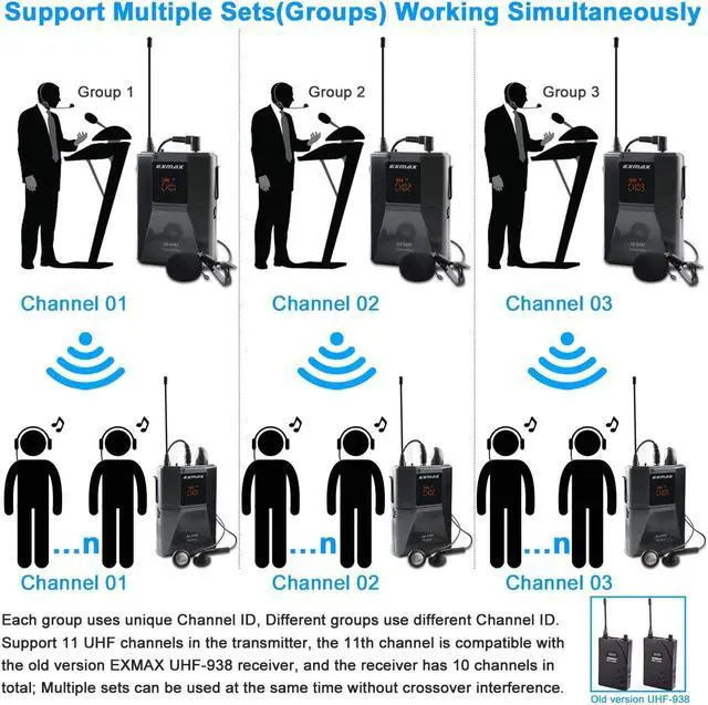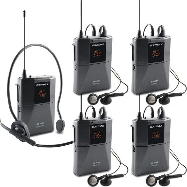 Long-distance range UHF wireless voice acoustic audio transmission systemEXMAX EX-938 wireless headset microphone tour guide simultaneous interpretation church translation system could transmit the voice of who speaks to the microphone of transmitter to the people who wear earphone of the receivers,transmission distance is about 150 meters/492ft.This EX-938 voice acoustic transmission equipment helps tour groups/speakers/lecturers/minister overcome background noise and keep social distancing.