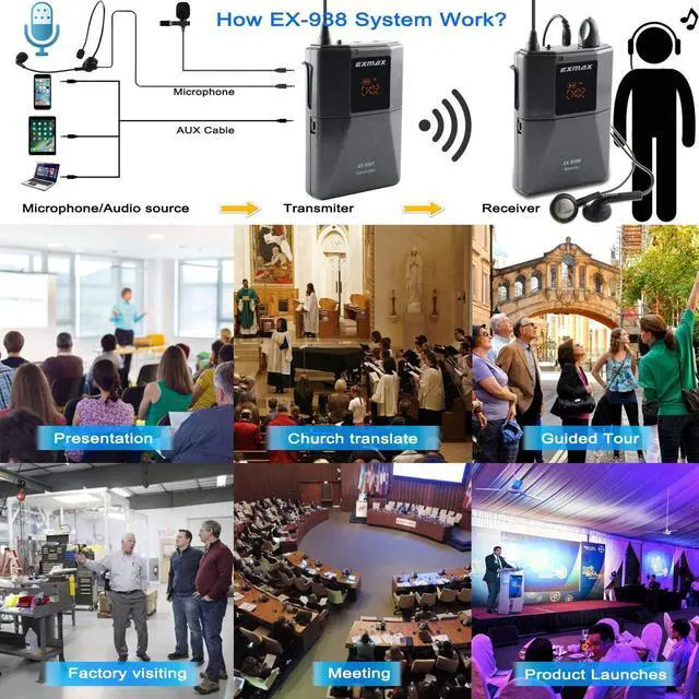 Various ApplicationsWith overcoming noise and distance issues and making sure your message is heard clearly, EXMAX EX-938 wireless audio voice transmission system is widely used as Simultaneous Interpretation system,Church Translation system,Audio Tour Guide System,Social Distancing Solutions,interpreter assisted listening system,wireless voice transmission tour guide transmitter speaker microphone, interpretation devices, translation headsets,presentation audio system,in ear monitor system.