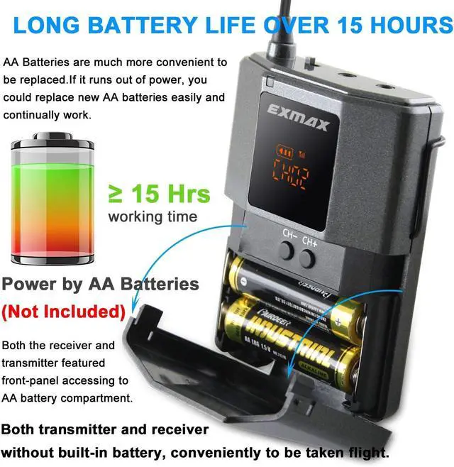 Easy OperationAA batteries as power supply,low power consumption design for long working time over 15 hrs,easy operation on battery replacement,no built-in battery makes it conveniently to be taken on flight.EX-938T transmitter has two input jacks, AUX and MIC,AUX is for external audio input, such as music playing from CD or MP3/MP4 player;MIC is for real-time human voice inputting,such as teaching,training, touring,speaking etc.Please dont mix up the two jacks,otherwise you will get noise.