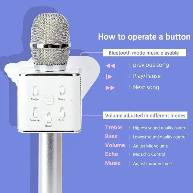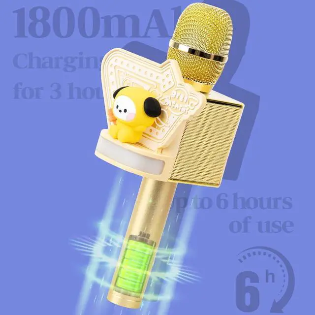 GREAT QUALITY & FUNCTIONS - BTS Inspired Character Wireless Mic allows you to play music up to 6 hours on its dual speaks! After charging it for 2 hours, you can use BTS Inspired Character Wireless MIc/Speaker for up to 6 hours. Use the slide controls to control the Treble, Bass, Volume (Mic), Volume (Music), and Echo! Lastly, This BTS Inspired Character mic allows you to connect your own USB flash drive!
