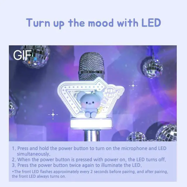 EASY PAIRING- BT21 Minini Character Wireless Mic can be easily paired to any device. After switching on the microphone the Bluetooth function is ready for use. Turn on the Bluetooth on your device and connect it to the Bluetooth Name: BT21 Minini MIC. After it is successfully connected it will appear on the right side of the Bluetooth Name connected, and now you can use your wireless microphone.