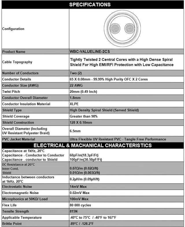 WBC-VALUELINE-2CS (22 AWG) is a Low-Capacitance, 22AWG Microphone, Active-Speaker & Interconnect cable. Result of years of rigorous R&D, the 2CS boasts a UV-protected jacket, a dense spiral shield, an XLPE sub-shield & two, 22AWG 99.99% Oxygen Free Copper cores made out of 0.08mm Ultra-fine strands. Excellent shielding cancels out all EMI & RFI, this Road-ready cable will encounter, resulting in a pure signal transmission. The Flexible, Tangle-Free jacket makes the cable extremely user-friendly.