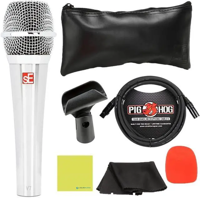 INCLUDES: sE Electronics V7 Supercardioid Dynamic Vocal Microphone in Chrome finish, a Pig Hog PHM10 8mm Mic Cable, and a Liquid Audio Polishing Cloth.