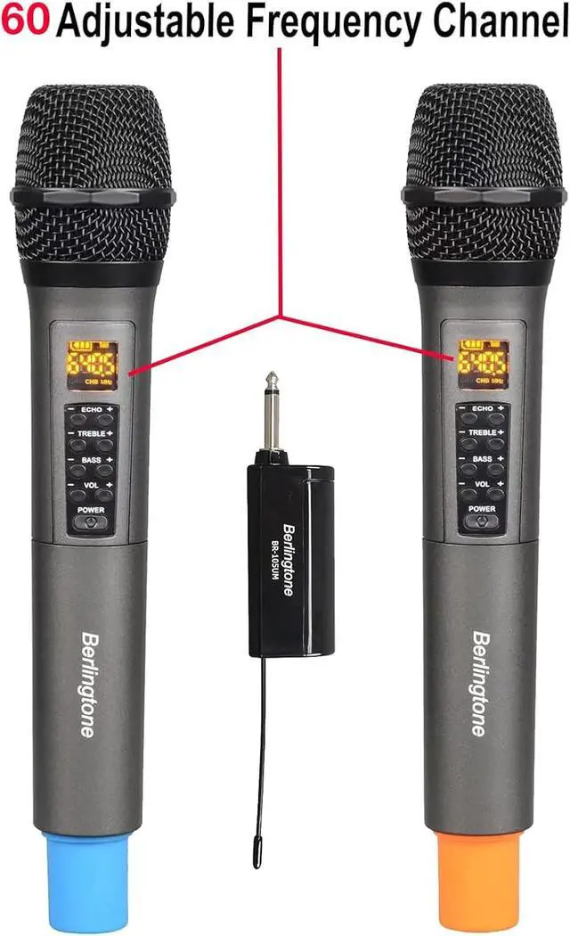 Wireless microphone system with echo/treble/bass, the wireless karaoke microphone set has echo, treble, bass control button, you can use different sound effects according to different songs The wireless mics have 60 channels, For karaoke, speech, meeting, conference, indoor, outdoor.