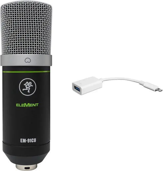 Package Includes: (1) Mackie EM-91CU USB Condenser Recording Zoom Podcast Microphone Mic+Shockmount. (1) Rockville iUSB USB-A to Lightning Adapter Dongle USB Mirophones to iPhone/iPad. Features: Perfect for content creation, online meetings, voiceover, music. Effortless plug and play setup. Affordable professional-quality condenser microphone. Rugged, reliable construction. Cardioid polar pattern. USB connection. Sample rate: 16-Bit / 48kHz