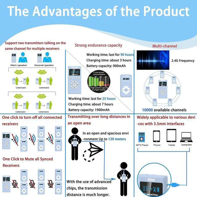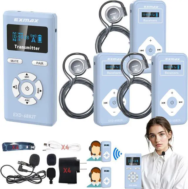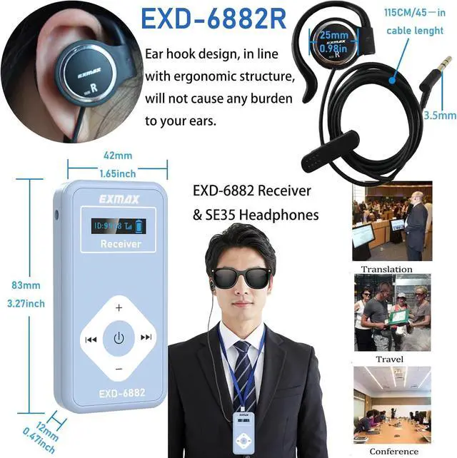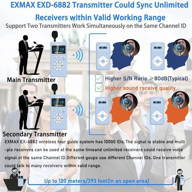 Advantage FeaturesEXMAX EXD-6824 Wireless tour guide system enable up to two tour guides speech on the same channel in each group, allowing them to take turns at regular intervals to reduce fatigue. Transmitter also has an AUX input which enables to connect a MP3, Smartphone, MP4 to the system, to play background music or pre-recorded voice files. 9999 Selectable 2.4GH z licence-free global channels accommodate hundreds of groups working simultaneously as long as they work on the different channels.