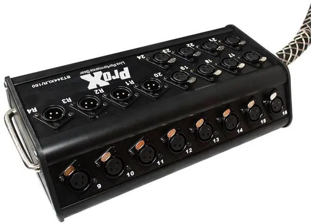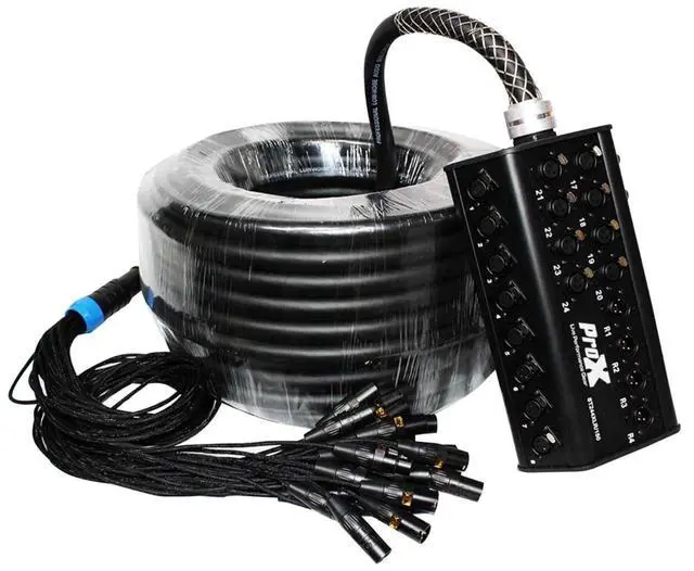 Features: ProX XC-SB244XLR100 100' XLR Stage Extension Box w/24 XLR-F+4 XLR-M Snake Cable, Braided OFC Copper Compact shield to reduce noise and protect pure sound transfer.