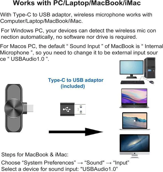 COMPATIBLE WITH iPhone / iPadGRTPRTS wireless lavalier microphone works with iPhone 5/6/7/8/11/12/13, 7 Plus/8 Plus/11 Pro/11 Pro Max/12 Pro, X,/XR/XS/XS Max, and iPad 2/3/4, iPad Air series, iPad Pro series(NOTE: the latest version of 12.9 inch and 11 inch iPad Pro with type-c port not supported) ***Only support IOS system version 13 to 15.5, please upgrade your phone system if the wireless microphone doesnt work properly***