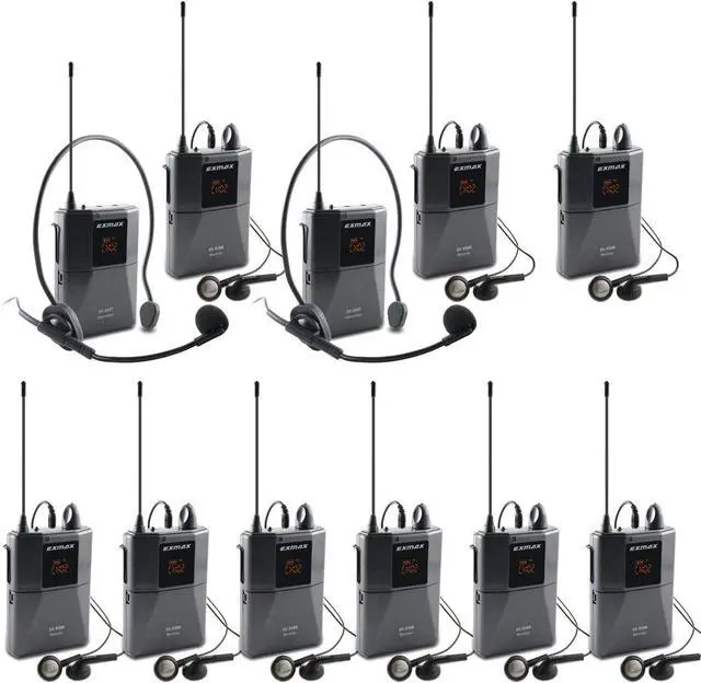 Long-distance range UHF wireless voice acoustic audio transmission systemEXMAX EX-938 wireless headset microphone tour guide simultaneous interpretation church translation system could transmit the voice of who speaks to the microphone of transmitter to the people who wear earphone of the receivers,transmission distance is about 150 meters/492ft.This EX-938 voice acoustic transmission equipment helps tour groups/speakers/lecturers/minister overcome background noise and keep social distancing.