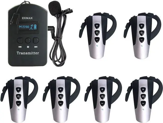 Receivers could hear TWO transmitters simultaneouslyEXMAX EXD-6824 wireless audio whisper sound transmission system could transmit audio voice messages from a presenter to an audience. What makes it amazing is that receivers could hear voice messages from two transmitters on the same channel,it means that audience could hear two presenters or tour guides talking in each group;When speaking to main microphone transmitter,the deputy transmitter could send background music to receivers.