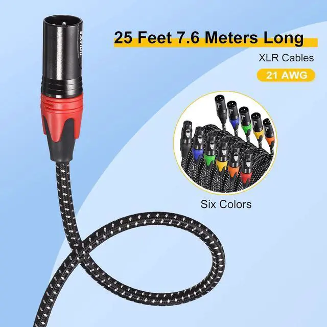 The microphone cable is 25 Feet 7.6 Meters long, 21AWG, Red, Orange, Yellow, Green, Blue, and Black six colors at the end,In the package of 6 x XLR cables.