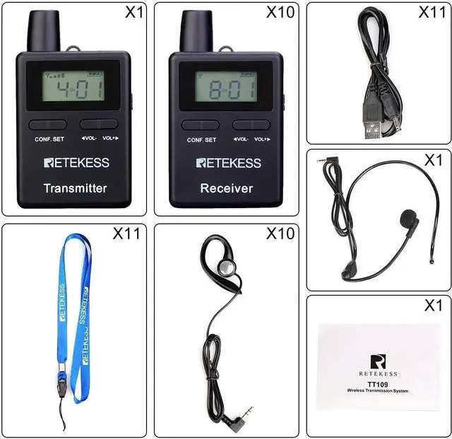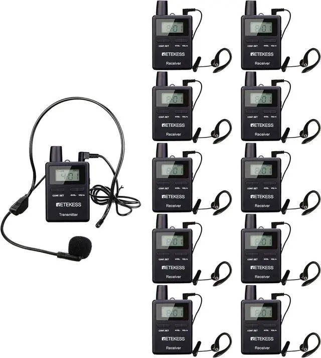 Wireless church translation system with 2.4GHz signal transmission; stable audio quality; 50 selectable channels; universal worldwide; 50 IDs allow up to 50 groups to operate simultaneously in the same vicinity