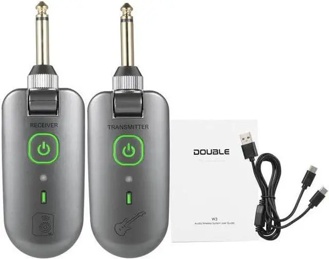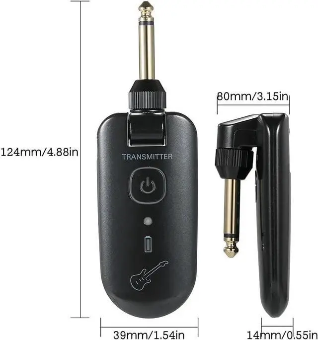 225° rotatable 1/4" plug, widely apply to all audio equipment with 6.35mm jack. Built-in li-polymer battery, enduring more than 4 hours use time. Equipped with a type-C cable to charge transmitter and receiver simultaneously.