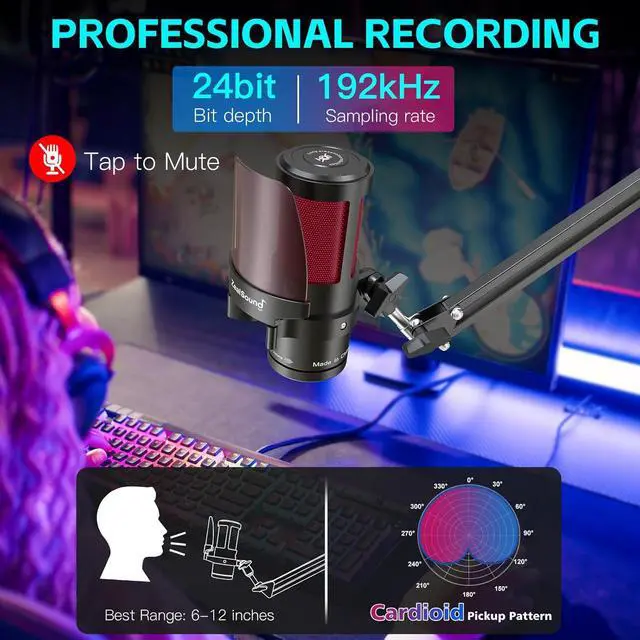 192kHz Studio-Grade Sound Quality This PC microphone features a 192kHz/24-bit high-resolution sampling rate, capturing every nuance of your voice with exceptional depth and clarity. The condenser capsule provides a wide frequency response and high sensitivity, delivering clean, natural, true-to-life soundperfect for vocals, instruments, or detailed spoken audio. The cardioid pickup pattern focuses on your voice while reducing ambient noise for a rich, broadcast-quality tone. The detachable metal pop filter further enhances clarity by blocking plosive sounds (like P and B), ensuring smoother, more polished recordings without distortion. Great for streaming, podcasts, gaming, ASMR.